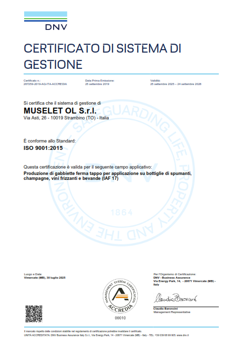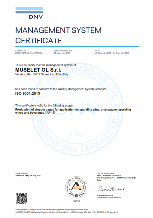 Di seguito elenchiamo le certificazioni delle gabbiette fermatappo prodotte da Muselet OL: